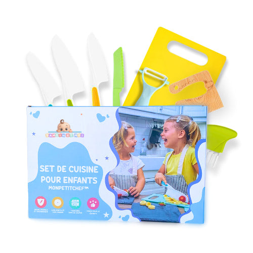 Et voilà notre kit MonPetitChef™ ! Le célèbre et l'unique set de cuisine spécialement conçu pour vos bambins. Anti-coupure et fabriqué sans BPA, parfait pour l'apprentissage !