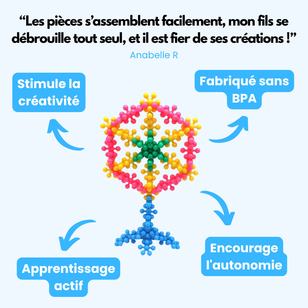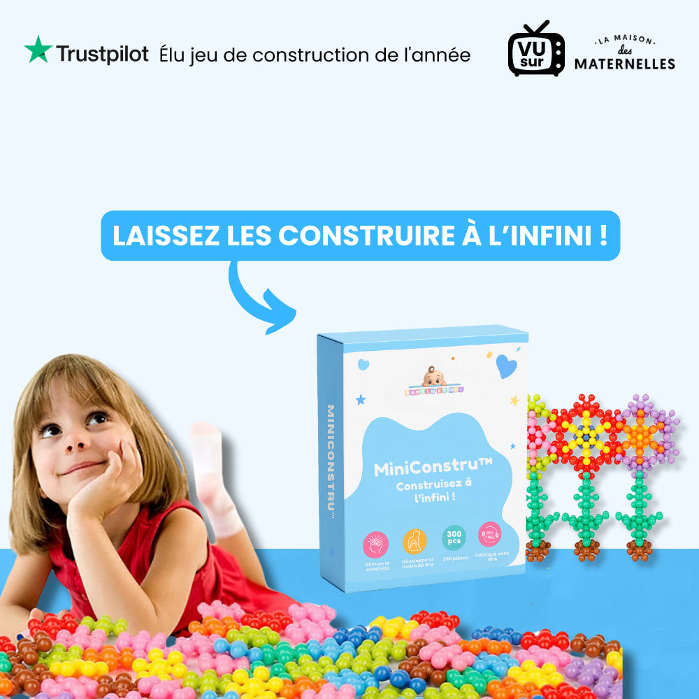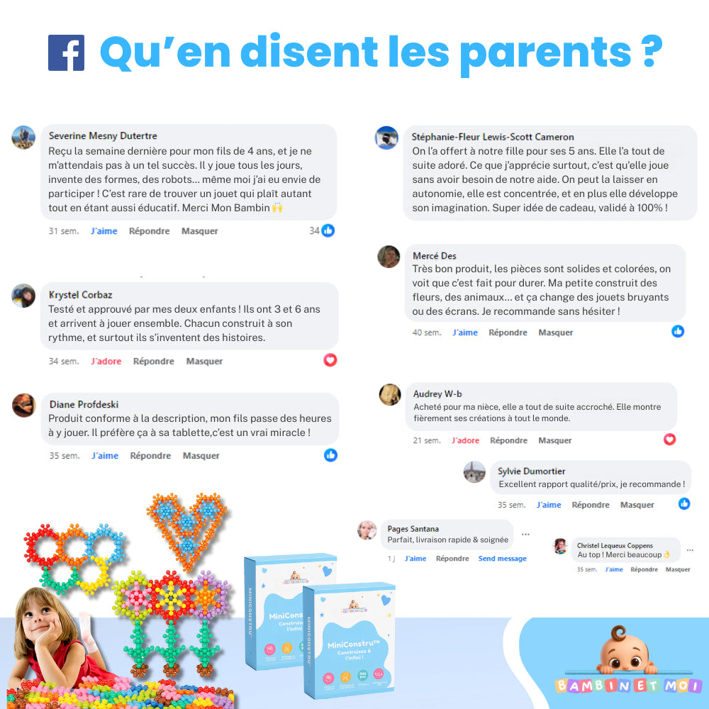 Offrez à votre enfant bien plus qu’un simple jouet : MiniConstru™ est un outil inspiré de la méthode Montessori, qui transforme chaque session de jeu en une véritable aventure créative. Avec ses pièces colorées à assembler, il invite les enfants à construire, inventer et rêver...
