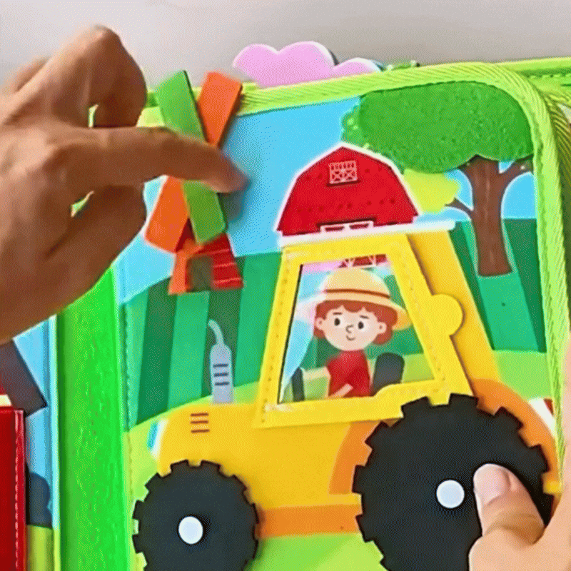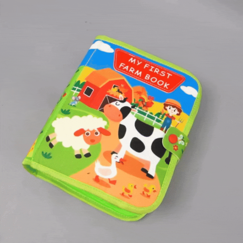 BusyBook – Ferme propose une découverte du monde agricole à travers des pages colorées et interactives. Chaque élément est manipulable : les enfants peuvent toucher, saisir, scratcher, glisser.
